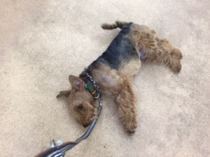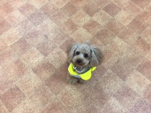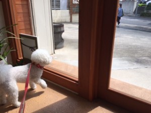 外の刺激に反応しやすいはなちゃんはロビーから外を歩く人を無視する練習です。