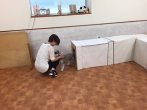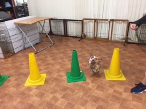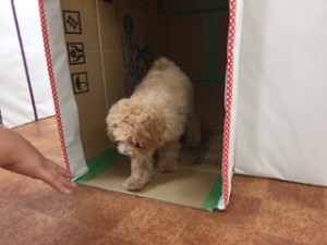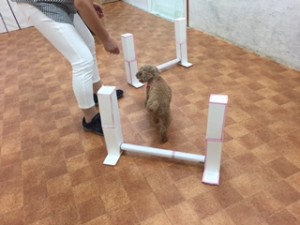 飼い主様に出口から呼んでもらうことで勇気を出してくぐり抜けることが出来るようになりました!