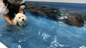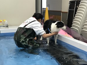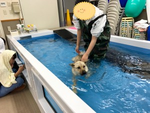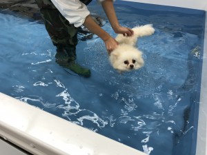 わんこラボでは、スタッフと一緒にプールに入っていくので