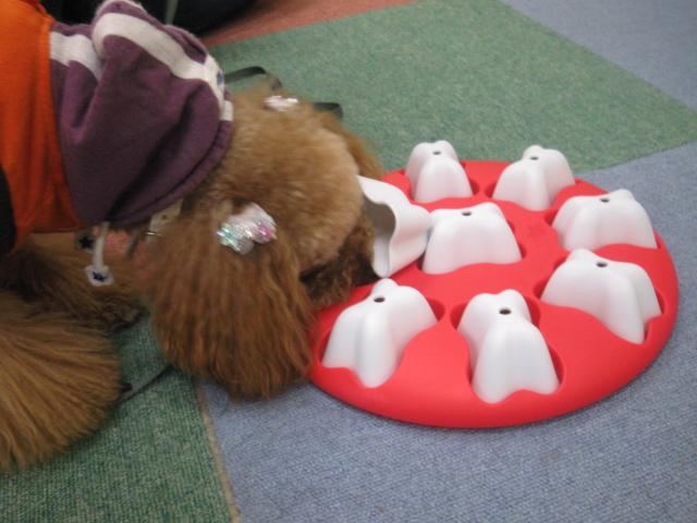 こちらは、知育玩具でおやつを取ることを頑張っているハウンくん♪