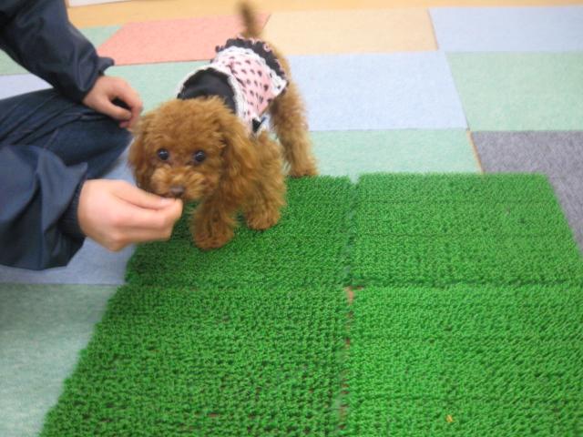 小梅ちゃんの場合は、好奇心旺盛なのでおやつにつられてとりあえず前足だけ足場に乗ることが出来ました。腰がひけつつも、全身のることが出来ました^^慣れない足場はおいしい場所!というイメージをつけてあげると、乗ることはもう恐くないですね☆