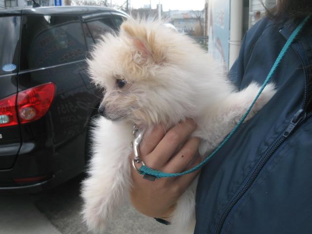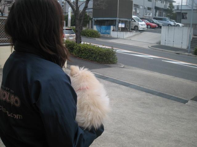 外に慣れる練習の最中のぱんちゃんです☆まだまだ赤ちゃんのぱんちゃんには、車・バイク・自転車・通行人・風・・・全てのものが初めてで、全てのものに慣れていかなければなりません。まだ、ワクチンの接種が終わっていないので、抱っこでお外に出かけます。全てのものを見た瞬間におやつを食べさせてあげます。全てのものが恐いと思う前に、おいしいイメージをつけてあげます^^
