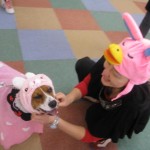 うさぎさんに連れられるビーグルのりょうちゃん。
