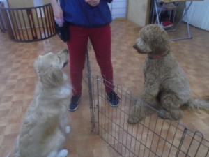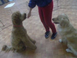柵越しで集中ができたら柵を外して実際に触れ合っている状態でお互いをお座りさせていきます。